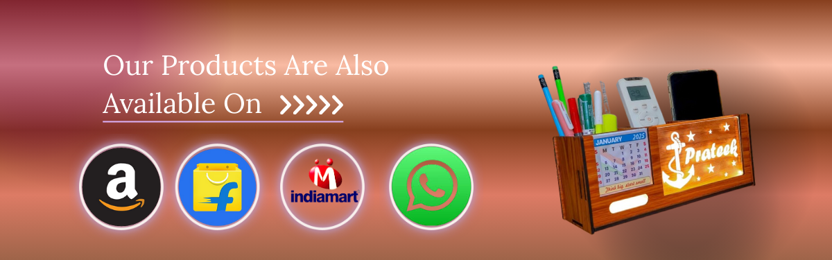 stylish wooden pen stand, pen holder, desk organiser for office/study table with calendar, personalised gift decor with LED name light, customised gifts for women, men, and girls.