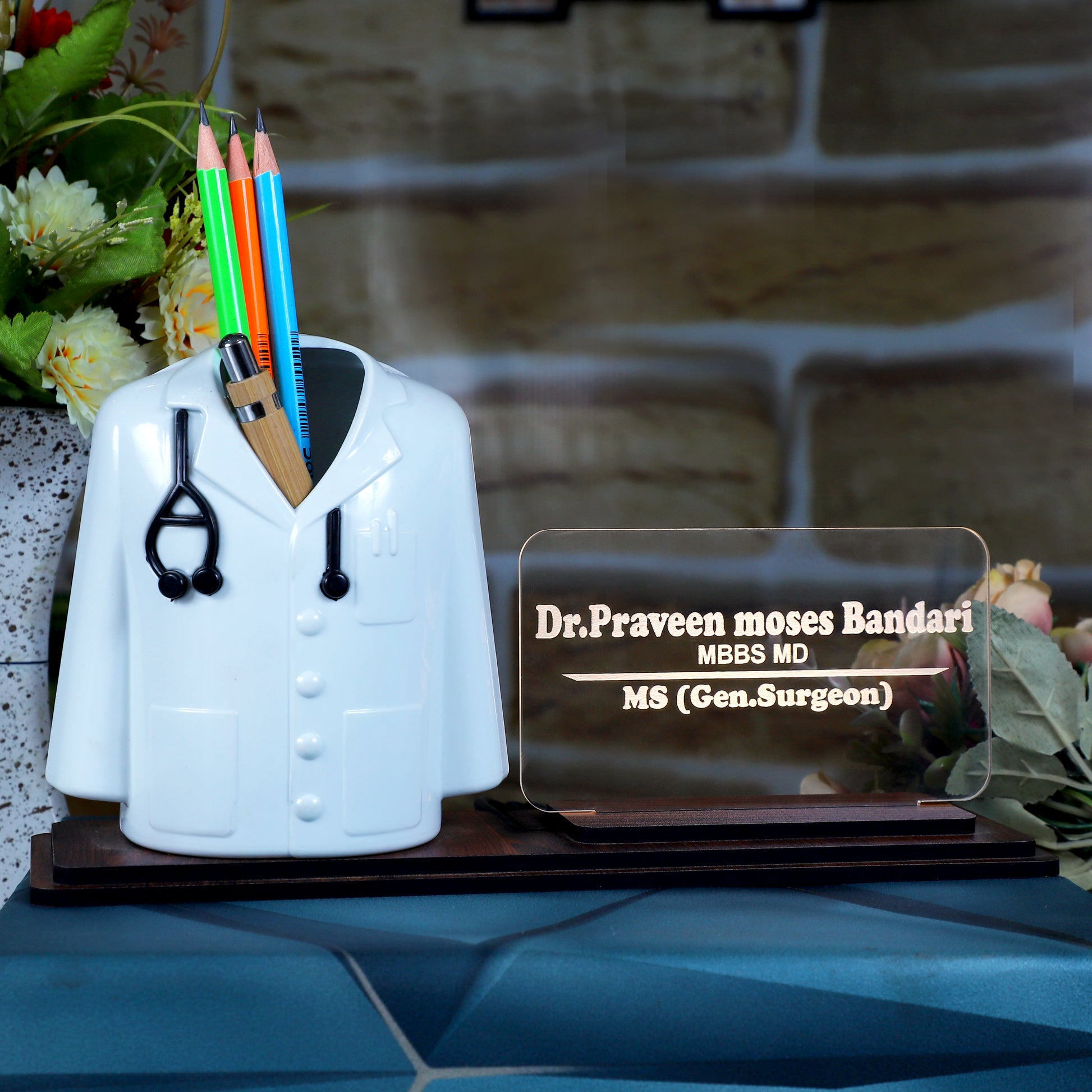 Doctor Coat Pen Stand with LED Name Plate, Wooden Base, Bamboo Pen & Personalized Wooden Keyring | Customized Desk Organizer for Doctors & Medical Aspirants | Apron Shape Pencil Holder