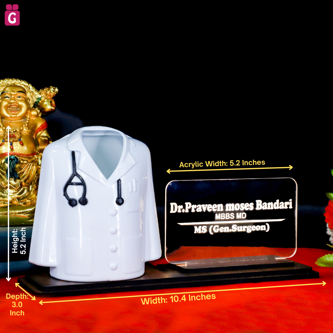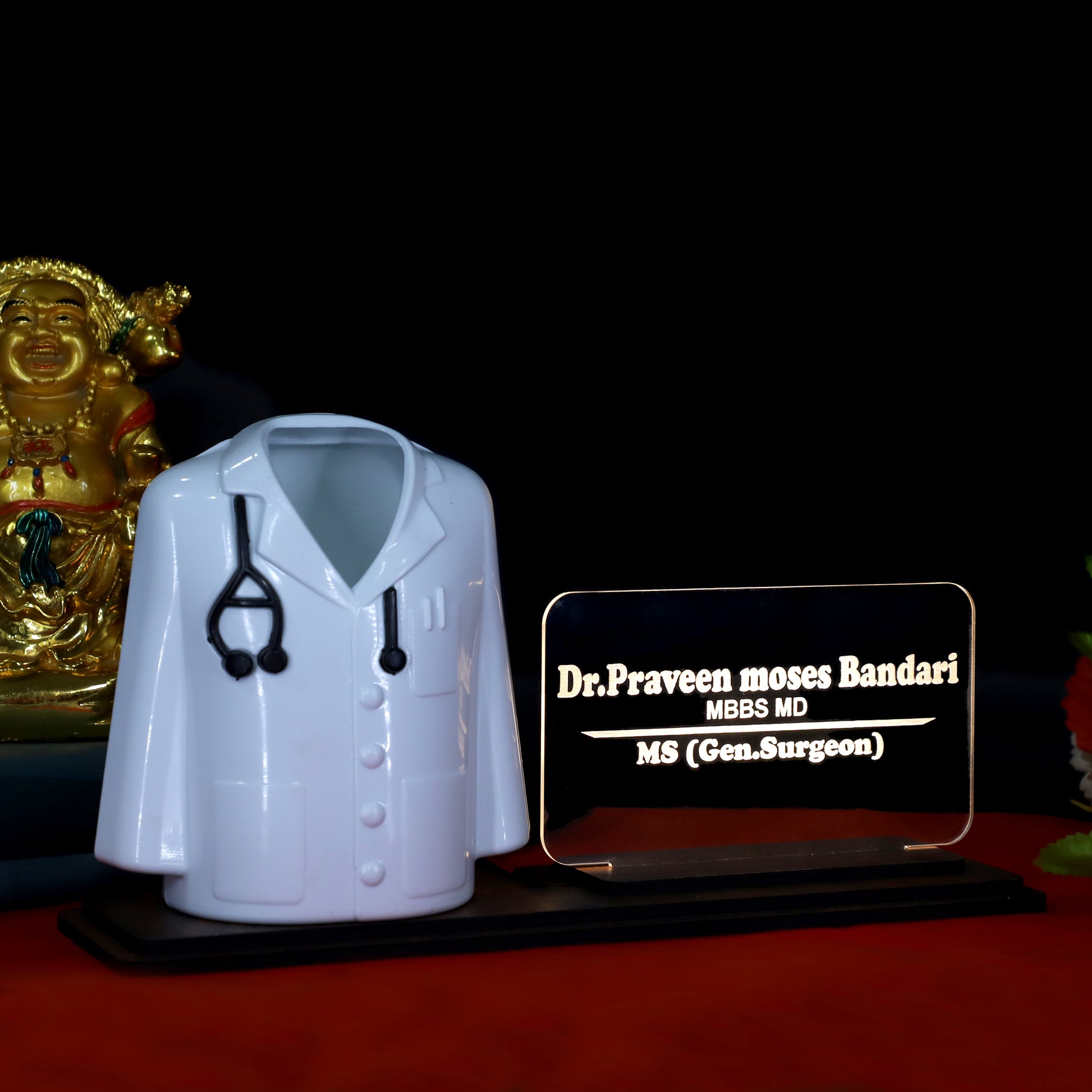 Celebrate the spirit of the medical profession with the Giftationery Doctor Pen Holder, a thoughtfully designed desk organizer that combines functionality, elegance, and personalization. This unique customized gift for doctor features a doctor’s coat–style pen stand paired with a glowing acrylic LED name plate that highlights your name or designation beautifully. Perfect as doctor gifts or gifts for doctor on special occasions like birthdays, anniversaries, or Doctor’s Day, this piece adds both professional charm and utility to any workspace. Whether you are looking for a doctor gift for men, a gift for doctor male, or doctor gifts for women, this pen stand suits every medical professional — from doctors and surgeons to nurses and physiotherapists. It also makes an excellent choice as gifts for physiotherapist doctor and other healthcare specialists. The LED name plate doubles as a soft doctor lamp, illuminating the workspace while serving as one of the most eye-catching doctor table accessories. Crafted from durable materials and finished with precision, it enhances doctor clinic decoration items, doctor table decoration items, and even doctor room decoration items, adding a touch of class and professionalism. This premium piece is more than just a doctor gift item — it’s a statement of appreciation and pride. From thoughtful doctor appreciation gifts to stylish doctor clinic equipment, it perfectly reflects the dedication and care symbolized by the white coat. Pair it with a doctor keychain or doctor coat for women for a complete gifting experience that any medical professional would love to showcase on their desk. Add elegance, functionality, and emotion to your workspace with this one-of-a-kind doctor pen holder, a true blend of design and meaning from Giftationery.